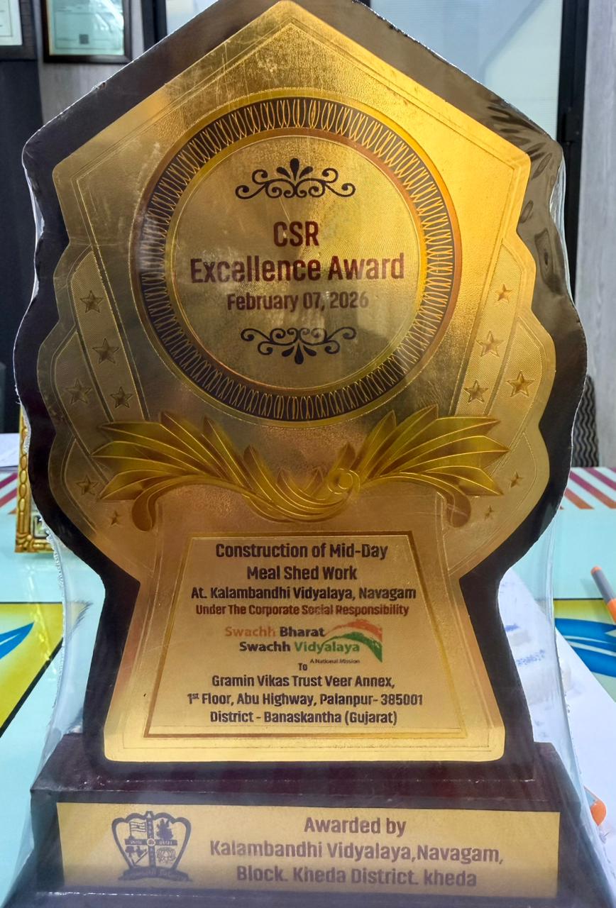 Gramin Vikas Trust has received the CSR Excellence Award from Kalambandhi Vidyalaya, Navagam, District Kheda. This recognition was given for the excellent construction of a Mid-Day Meal Shed for school children. The project was implemented under the CSR initiative of ONGC- Oil and Natural Gas Corporation. The Mid-Day Meal Shed has improved the facilities and hygiene standards for students. Gramin Vikas Trust remains committed to community development and quality education.